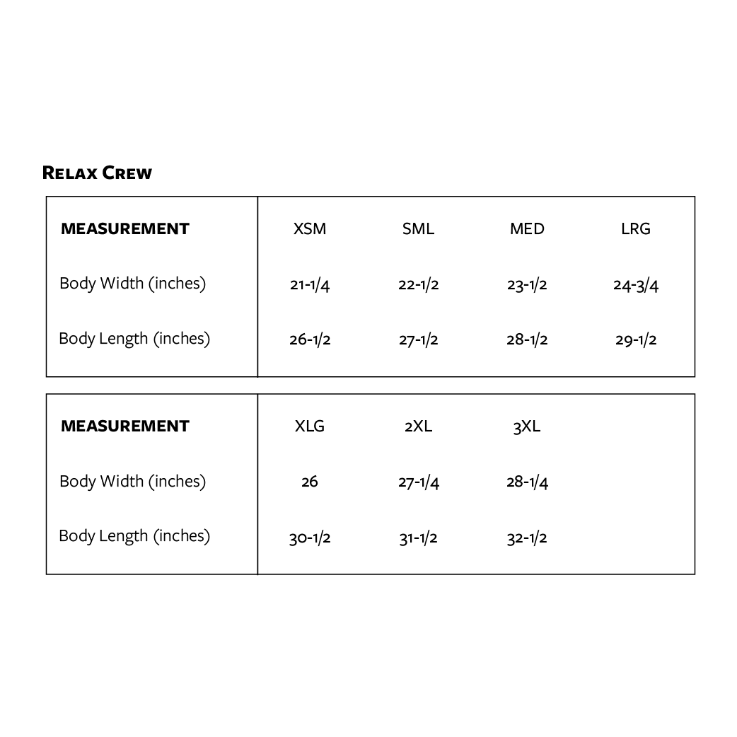 Introducing the Relax Crew, crafted with a relaxed fit and mid weight 9.4 oz fleece.